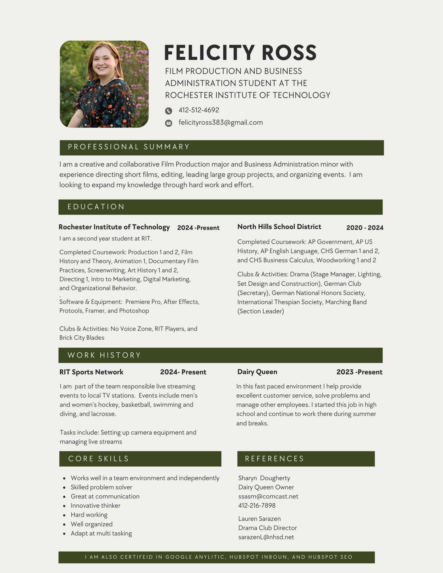 Hi, my name is Felicity Ross, and I am a filmmaker and editor from Pittsburgh, PA. I am a current second year Film Production Major and Business Administration minor at the Rochester Institute of Technology. I have a passion for video editing, digital marketing, and all thing Movie related. Feel free to check out my resume and some of my projects!